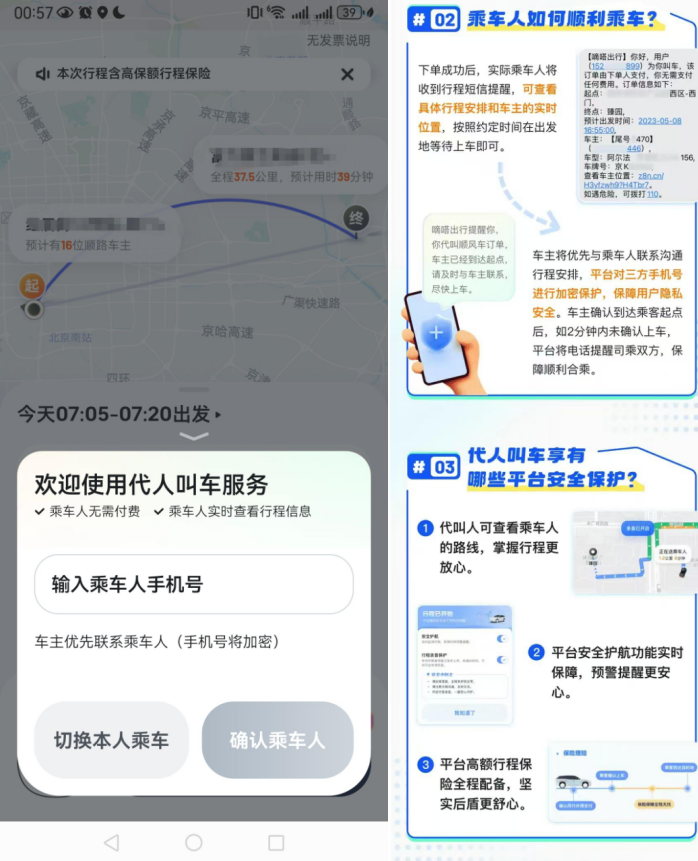 在规则共守方面,提醒用户全程通过平台来交易,避免线下交易,以免失去平台的行程保险,安全护航等出行保障。同时,确保“人车一致”:车主确保本人接单和本人接驾,在出发去接乘客和到达乘客起点这两个节点,完成人脸识别认证。同时,车主应确保线上接单车辆与实际接驾车辆一致,若有车辆信息变更,请及时更新。乘客上车前点击查看【车主信息核验卡】,确认车辆与订单显示一致,若车主正在人脸识别,请耐心等待识别通过后再上车,如遇“人车不符”情况,请拒绝合乘。此外,乘客应规范使用“代人叫车”功能:勿为无陪同的未成年人,或需要看护的人员代叫车。