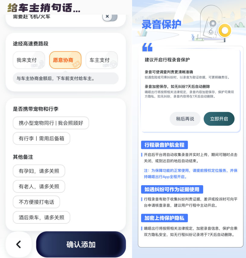在友善合乘方面,提醒用户行前充分沟通协商,若有携带宠物、大件行李或有同行亲友特殊需求,须做好下单备注,且若携宠出行,须配备专业笼具。乘客设置好高速费分摊方式,车主接单即表明接受该分摊方式;车主乘客可通过IM消息功能充分协商好路线、上车点和时间等事宜,让合乘更顺畅。在合乘途中,嘀嗒出行建议同路人礼貌交谈,相互尊重,包容互谅,全程开启“行程录音保护”功能,多一分安心。